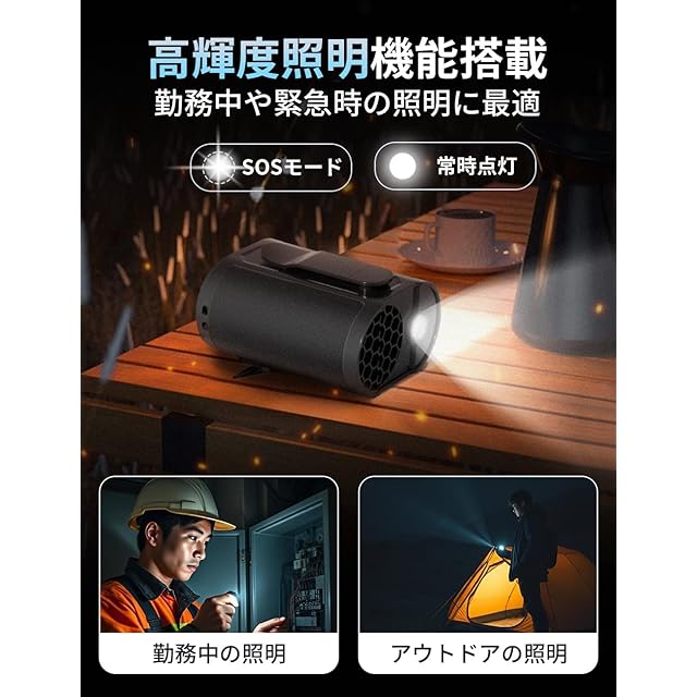 【懐中電灯機能付き】このベルトファンには便利な懐中電灯機能が搭載されています。点灯モードは「常時点灯」と「SOS点滅」の2種類から選択可能。夜間の屋外作業やキャンプ、防災グッズとしての備え、停電時の緊急ライトなど、さまざまなシーンで大活躍です。
