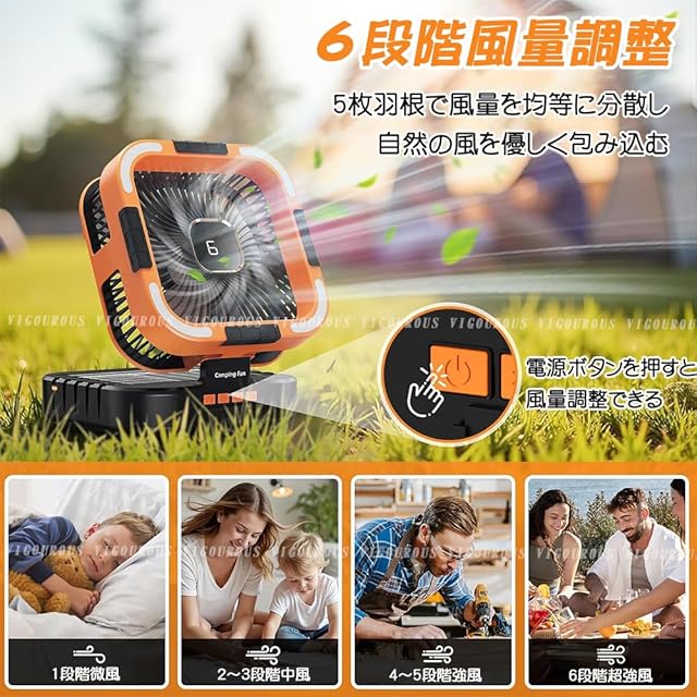 【アウトドア愛好家にとって最強のソーラー扇風機】【アウトドア愛好家にとって最強のソーラー扇風機】VIGOUROUSで生産した2025年最新のソーラー扇風機(大容量10000mAh)は大きな太陽電池パネルを搭載し、室外でソーター充電できます。5V/2Aの充電器で充電することもできます.。折り畳み可能なデザインで、持ち手が付いているので、旅行にとても適しています。折り畳み可能なデザインで、持ち手が付いているので、旅行にとても適しています。LEDライトとハンドルも付きで、キャンプライト、アウトドア扇風機、テントファン、ポータブル扇風機と壁掛扇風機として、キャンプでも、ピクニックでも、ビーチで一日を過ごすのでも、お客様のニーズに簡単に対応し、どこに行っても涼しく快適な時間を楽しむことができるので、アウトドア愛好家には理想的なキャンプ扇風機です。