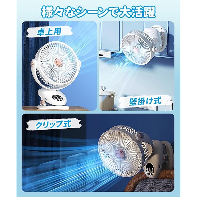 【2025年新登場オールシーズン使える多機能扇風機&USB充電式】2025年に新開発された多機能扇風機は、左右自動首振り、5段階風量調整、タイマー、LEDライト、リモコン、アロマ、LCD残量・風量段階表示、クリップ、壁掛けなどの便利な機能が付いています。クリップ扇風機は4000mAh充電池内蔵し、フル充電後、最小風量で約12H時間の連続使用可能、最大風量でも約2時間連続使用が可能です。(注:単一機能使用時。照明、首振り機能を併用すると、航続時間が短縮されます。)便利なUSB充電方式を採用しており、モバイルバッテリー、カーチャージャー、パソコンやUSB充電器などから楽々に充電できます。また、充電しながらも使用可能、暑い夏を涼しく過ごすことができます。これは真夏の熱中症対策の必需品です。