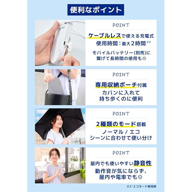【使用時間】内蔵バッテリー使用時 ノーマル:約1時間20分 エコ:約2時間 モバイルバッテリー(10000mAh)使用時 ノーマル:約5時間 エコ:約10時間 ※使用時間は、周囲の環境やモバイルバッテリー(別売)の性能・容量により異なります。 【充電時間】約3時間