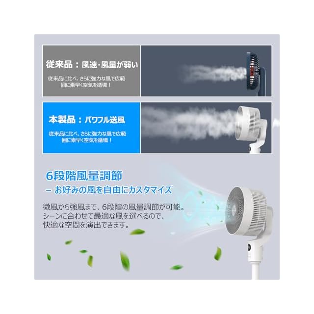 【風量6段階調整&驚き超静音設計】スイッチ1つで風量は微風から強風まで6段階調整ができるので、部屋の空気循環、換気、衣類乾燥など、さまざまなシーンに対応できます。環境に応じて切り替えることができ、強力な風で夏の暑さを吹き飛ばし、一年中快適に使用できるエアサーキュレーター扇風機です。丁度よい風を堪能できますし、小さく場所を取らないので卓上 扇風機としても使用可能です。稼働中の音が囁き声と同レベルで、気にならない静音設計です。就寝時も静かな環境が得られ、作業も邪魔せず圧迫感を感じさせません。