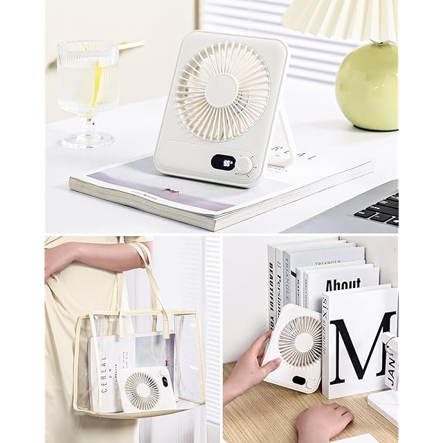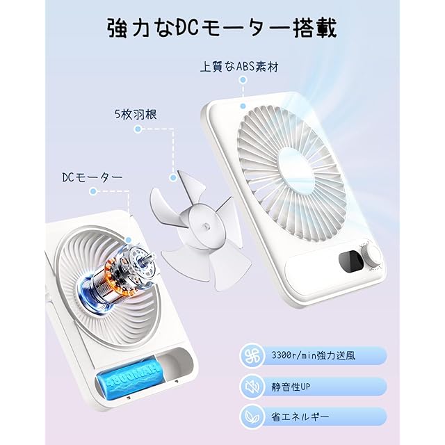 「3way使用可能のポータブル扇風機」 扇風機の寸法はわずか16.4*13.4*3.9cmになり、余計なスペースを占めず、オフィスの卓上に置いたり、バッグの中に入れたりすることができます。折りたためるキックスタンドの設計を採用しており、スタンドの部分は180°調整でき、卓上置きだけではなく、壁に掛けることも可能です。