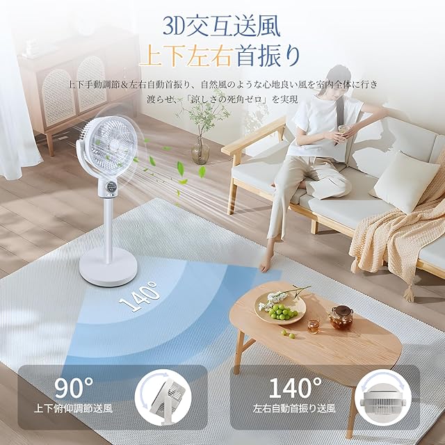 【立体パワフル送風、上下90°手動、左右140°自動首振り】このサーキュレーターは立体送風システムを搭載し、人間工学に基づいた多角度調整が可能です。上下90°の手動調節で、使用シーンや環境に合わせて自在に送風角度を変更できます。左右140°の自動首振り機能により、部屋全体の空気を効率よく循環させ、隅々まで快適な涼しさをもたらします。就寝時に首振りモードを使えば、直吹きによる不快感や健康リスクを軽減でき、生活の快適さを高めます。