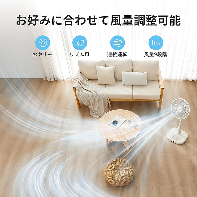 【DCモーター搭載】省エネ効率が優れており、DCモーターよりも約50%消費電力カット達成。また風量は1〜9段階で細かく調整でき、どんなシーンでも快適な風速を楽しめます。