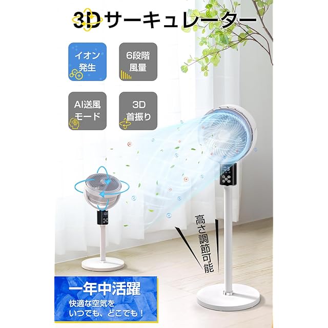 【360度の首振り機能&3種類送風モード&Alスマートシステム】】部屋中の空気をしっかりと循環させたり、部屋干しの洗濯物に風を当てたりとさまざまなシーンで使う場合は、360度の首振り機能を備えた、上下の首振り機能は、部屋の上部に溜まりやすい温かい空気と、下部に溜まりやすい冷たい空気を撹拌させ、室温を均一に保つ役割を持ちます。3つ送風モード(自然風モード/リズムモード/睡眠風モード)があり、その中に、リズムモードとおやすみモードが、Alスマート風量調整システムが搭載し、環境の変化に応じて風量調整が行われます。