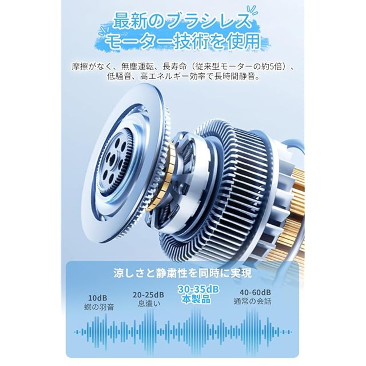 【超静音設計】この冷風扇風機は9枚羽根で設計され、風をより繊細にカットし、風をより静かで快適にします。また、この卓上エアコンはブラシレスモーターを採用しており、騒音は30dBと図書館レベルの静音性を実現し、同時にブラシを紛失することなく、寿命が30%延び、長期間の使用に耐える安定性と信頼性を備えています。