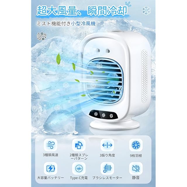 【2年間安心保証&充実したアフターサービス】当社の卓上冷風機は、お客様に長く安心してお使いいただくため、購入から24ヶ月間の保証期間を設けております。万が一不具合が生じた場合でも、迅速かつ丁寧に対応いたします。「製品の品質に自信があるからこそできる長期保証」で、お客様の夏の快適な生活をトータルサポートいたします。何かお困りのことがあれば、お気軽にご相談ください。【パッケージ内容】製品本体 *1、Type-C充電ケーブル *1、日本語取扱説明書 *1。