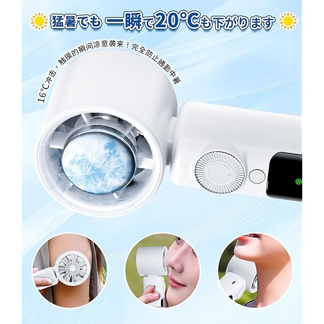 【瞬間冷却-20℃・冷却機能付き】冷却プレートを備えた手持ち扇風機で、ただ送風だけでなく、送風中に冷却スイッチを押すとプレートが急速に冷たくなり、それを頬やおでこ、手首、首元などに当てると、ひんやり冷え冷え感でお肌が即時クールダウン。猛暑の中でも氷のような冷たさが感じられ、お肌の温度を外気温から最大-20℃に冷却し、火照った顔に涼しさをお届け、熱中症対策に最適な携帯扇風機です。従来の扇風機を超えた、真夏の必須アイテムとして活躍する最新クーリングデバイスです。