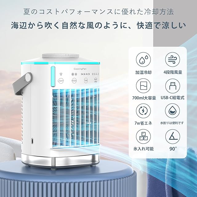 【USB-C給電でどこでも使える】USB-C接続により、モバイルバッテリーやPC、コンセントからも簡単に給電可能。停電時でも使用でき、猛暑の夜も安心。持ち運びやすいコンパクト設計で、取っ手付きだから移動もラクラク。いつでもどこでも快適な冷風をお届けします。