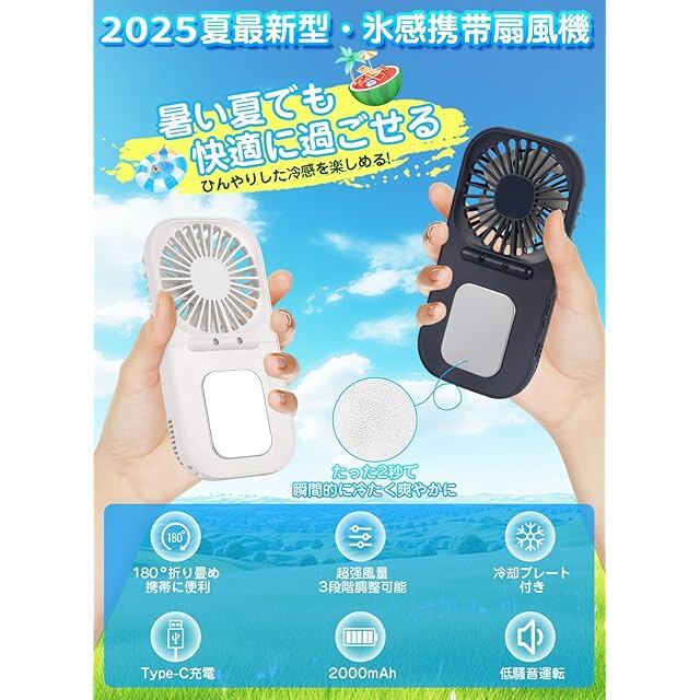 【冷却機能付き・手持ち/首掛け/卓上/4in1】この冷感扇風機は、従来の手持ち扇風機を超えて、効率的な冷却プレートデザインを採用しています。自然の風を送るだけでなく、暑い夏にも冷たい感触を提供することができ、まるでマイクロエアコンを持ち歩いているかのようだ。扇風機と冷却プレートは、異なるボタンで制御できます。ボタンを軽く押すだけで、2秒で冷却効果を感じることができ、顔のほお、おでこ、手首、首などに貼り付けると、皮膚の温度が最大19℃まで外気温から下がります。冷却プレートにより、2秒で肌に冷たさを伝え、日焼けや火傷の応急処置にも適しています。扇風機本体にストラップ取り付け穴を備え、付属のストラップと併用すると首掛け扇風機として使え、両手が解放するため、長時間使っても疲れにくく、作業中やスポーツなどの場合に勧めします。