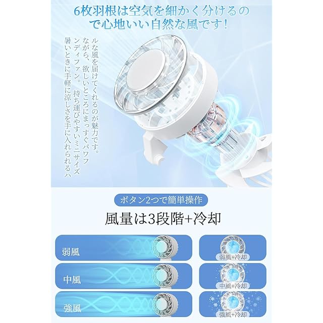 【3速風量調節・強力な送風・超静音技術】市販の一般的なハンディ扇風機と比べ、当社の扇風機は超小型ヘッドの空気力学設計に基づき、冷却板、DC気流構造を採用し、風の拡散を抑制する6枚のファンブレードを装備し、より強力な風、より広い風量範囲を実現しました。運転音は20dBと非常に静かです!周りに迷惑をかける心配がありません。職場や図書館など静かな場所でも快適に勉強できます。 また、風量も3段階で自由に調整可能、ボタンを押すだけでいい:1段は微風、2段は中風、3段は強風。2つのモード(ファンモード、ファン+冷却モード)により、暑い夏でも涼しさを実感できます。