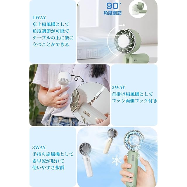【180°折り畳め・手持ち/首掛け/卓上3in1携帯扇風機登場】このミニ扇風機の重さはわずか170gで、卵を2つ持つように簡単に手に持つことができ、とても快適です!手持ち扇風機・卓上扇風機・首掛け扇風機3つの機能を同時に兼ね備えています。✨扇風機本体にストラップ取り付け穴を備え、付属のストラップと併用すると首掛け扇風機として使え、両手が解放するため、長時間使っても疲れにくく、作業中やスポーツなどの場合に勧めします。卓上扇風機としても使用でき、扇風機は180度まで折りたためるので、デスクトップに置いても安定し、オフィスや勉強中に最適です。