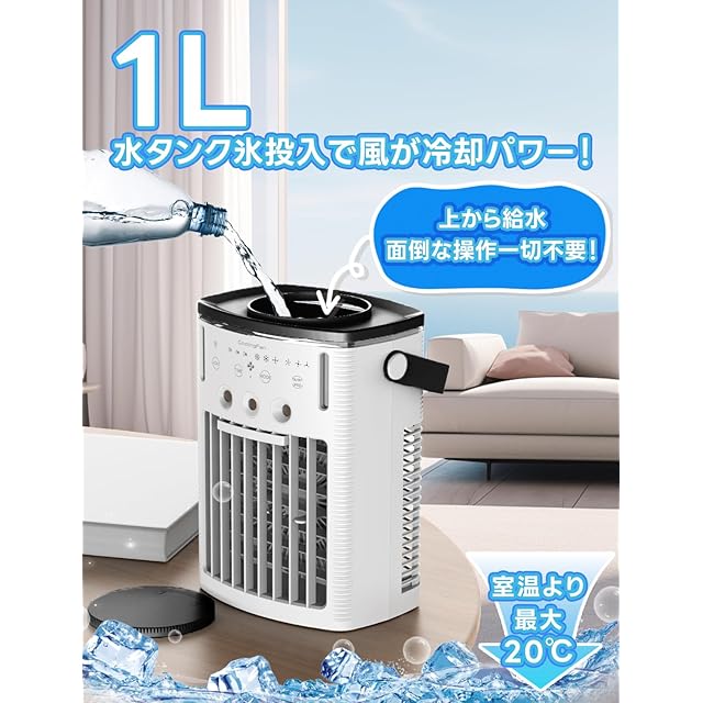 ❄【1L水タンク・氷投入で瞬時冷却パワーアップ】冷風扇は1L容量のタンクを搭載しつつ、本体はコンパクト設計。デスクサイドやベッドサイドに置いてもスペースを取りません。水だけでなく氷を追加すると、送風温度を最大20℃低下させ、より鋭い冷却効果を発揮します。タンク上部の広口デザインで氷の投入・補充もスムーズ。ミストと冷気の相乗効果により、従来の冷風扇では実現できなかった「瞬間的なヒートリリーフ」を実現。夏の集中作業時や就寝前の暑さ対策に、手軽に使える機能性を追求しました。【ご使用上の重要注意】水タンクには必ず新しい水道水をご使用ください(蒸留水・純水の使用は冷凍機能異常の原因となります)。冷却効率維持のため、1日1回の水交換を推奨。※ 油性エッセンシャルオイル等の添加は厳禁,水タンク内部の樹脂部品・超音波スプレー口が化学腐食する恐れがあり、故障の原因となります。アロマ機能を求める場合は、別売りの外付けディフューザーをご利用ください。