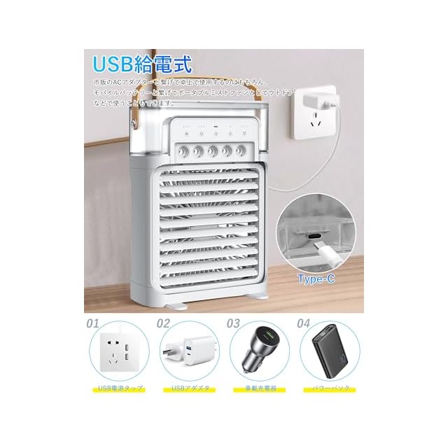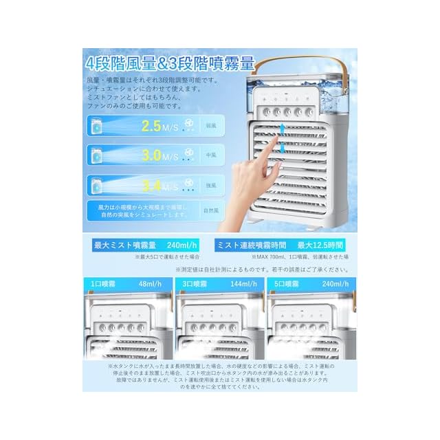 【冷風機・強い冷風が飛び出す・ひんやり】この冷風扇は革新の冷却技術を採用しており、従来の蒸発型の冷風機より、空気冷却は3倍アップ!冷風機には3段階の風量調節が可能で、自分が心地よいと感じる風量に応じて切り替えることができる。風量切替スイッチをタッチするごとに簡単に切り替えます。水を入れた後に十分な風量を確保しながら加湿器の保湿効果を実現しています。水タンクに水と氷を入れると冷却機能が始まり、冷却ファンとして使うととても快適で涼しく、子供や女性、高齢者などエアコンに敏感な人におすすめだ。*注意:製品にはUSBケーブルが付属しており、使用時には電源を接続して使用する必要があります。(本製品は充電式ではありません。)