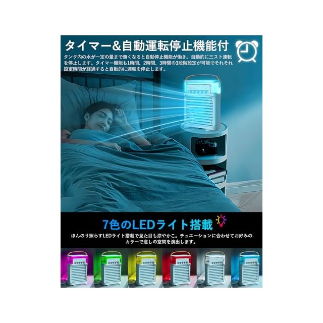 【900ML大容量水タンク・タイマー機能・静音運転・7色LEDライト】タイマー機能が付き、2h・4h・6h・8h・10h・12hに切り替えます。静音モーターを採用しており、読書、仕事に邪魔にならないのでご使用いただけます。また7色のムードライトも搭載、就寝時も快適です。クーラーが効きすぎていて寒い方や冷房のせいで風邪を引きやすい方やエアコンの電気代を節約したい方におすすめします。900mlの大容量水タンクが付き、一度の給水で長時間使用できます。頻繁に水を追加する必要ないです。途中水と氷を入れやすいし、丸洗いできて衛生的。