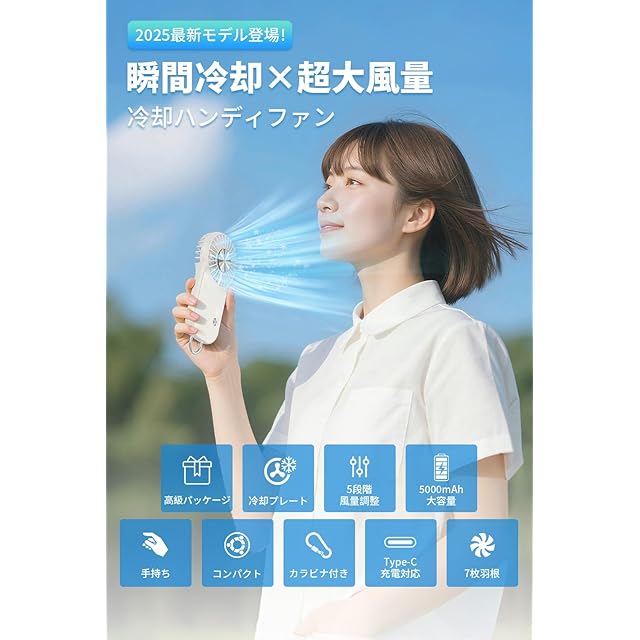 【5段階風力調節・自然風単独設定・強力送風】空気力学に基づいてデザインされた超小型ヘッドは、7枚の羽根を搭載し、風力の分散を抑制し、通常の ハンディファン よりも優れた送風効率を提供します。ボタンを押すだけで、自然風、低速、中速、高速、超高速の5つの段階から風速を切り替えることができ、心地よい風を選んで送風できます。【自然風単独設定(第1段階)】 ハンディ扇風機 は自然の風を模擬し、不規則な強弱の自然風を再現し、一定の周期で風を届けることで、自然風に近い快適性を追求し、爽やかな涼感を与えます。この5つの段階中で「クーラーボタン」を押すと、クーラー機能を併用できます。
