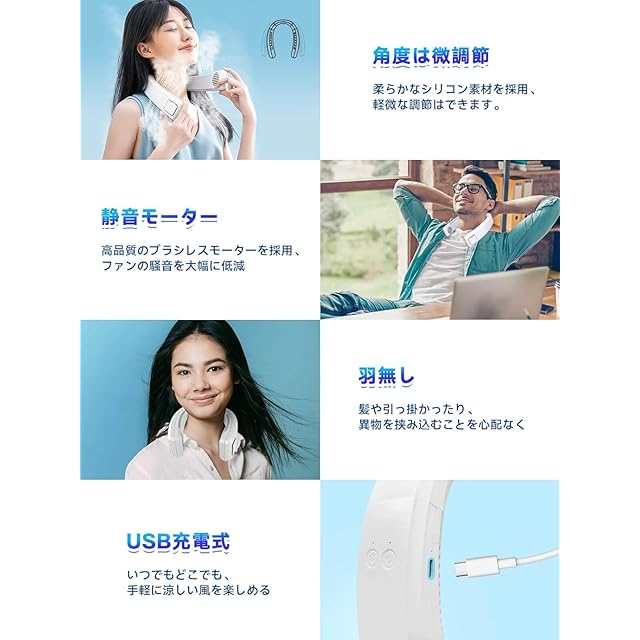 フィット感・色んなシーンで大活躍:扇風機の首掛け部分には広がりやすいようにシリコン素材を採用しており、性別を問わず使いやすいおすすめモデルです。シンプルなホワイトやブルーカラーがあるので、好みに合わせて選べます。重さはただ340gで、長時間かけても、疲れが感じません。バックに入れて持ち運びやすいコンパクト設計です。真夏のフェスやアウトドア、BBQ、スポーツ観戦、散歩、山登り、遠足、お祭り、通勤·通学などあらゆる場面で活用いただけます。