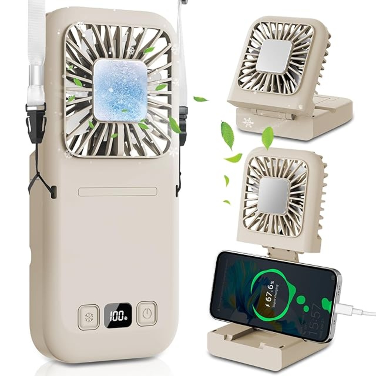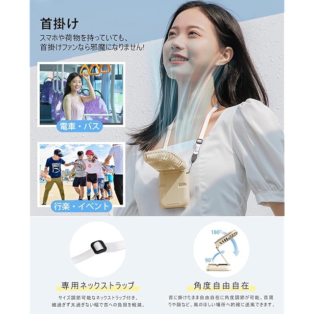 【5WAYで使える進化版&実用性抜群な「モバイルバッテリー」機能付き】手持ち・首かけ・卓上・モバイルバッテリー・スマホスタンドの5役を兼ね備えた、マルチなハンディ扇風機です。付属のネックストラップを取り付けることで「首掛け扇風機」になります。ネックストラップは長さ調節が可能です。ファンのヘッドを折り曲げると、「スマホスタンド付きの卓上扇風機」に早変わり!オフィス用の小型扇風機にも向いています。6000mAhのバッテリーとしてスマホの充電ができる!夏のレジャーは、キャンプや花火、海水浴など長時間のお出かけ時は電源の確保ができモバイルバッテリーとしても使えます。ひんやり涼みながら動画視聴、ビデオ通話などが可能です。外出先だけでなくリビングや寝室、オフィスのデスクなどに置いて使うのがオススメ。
