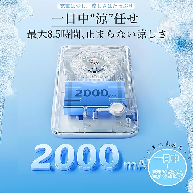 【最大8.5時間、頼れるバッテリー】 2000mAhの充電式バッテリー内蔵。 最大8.5時間も連続使用可能、真夏のお出かけやイベントでも安心です。 USB充電対応で、モバイルバッテリーからの充電もOK。外出先でもすぐにチャージできます。