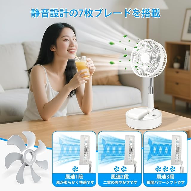 【4段階風量&7枚羽根】そよ風から強風まで4段階で調節可能。自然風のようなリズム運転も搭載し、長時間でも冷えすぎず快適。7枚羽根が風を細かく分け、肌に優しいなめらかな風を届けます。