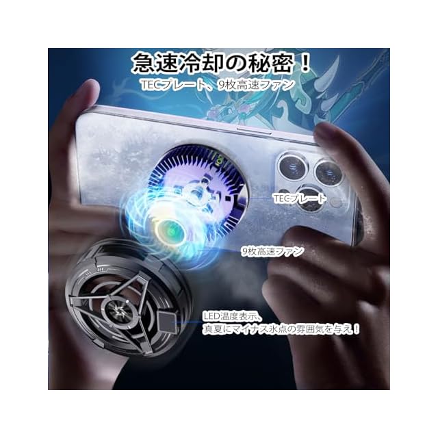 【3秒急速冷却】このスマホ冷却ファンは高性能熱伝導TEC(ペルチェ素子)を採用し、電源を入れて僅か3秒ほど10℃~15℃まで冷却でき、冷たく感じ、真夏にテレビ視聴、ライブ動画のネット配信、グーグルマップなど長い時間スマホを使用する場合にも最適!付属の冷却シートと組み、大人気ゲーム(原神、崩壊スターレイルなど)した時、発熱も効果的に抑えられます。