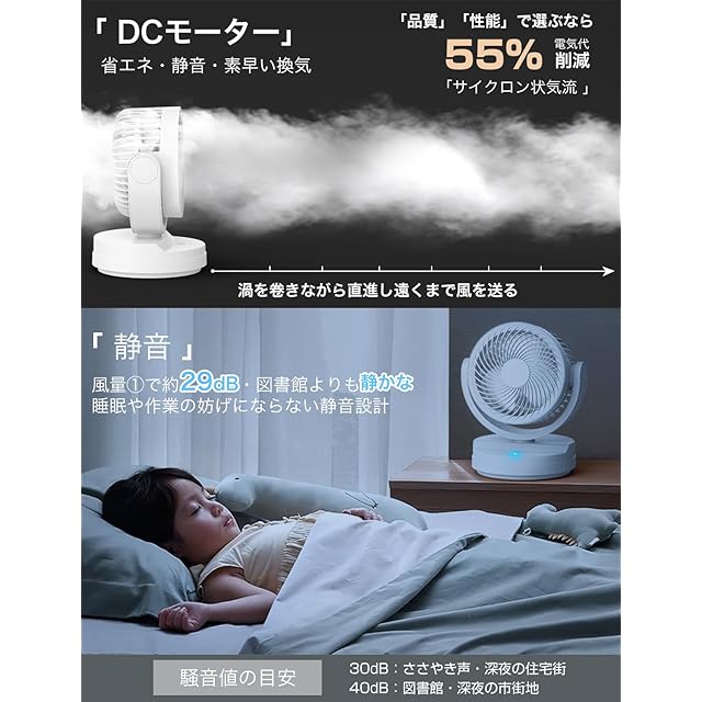 【静音・省エネ設計】・ブラシレスモーター採用で振動&騒音低減・風量1時29dB(ささやき声レベル)の超静音・図書館(40dB)より静かな睡眠環境を実現▼省エネ性能・従来比▲30%の電力削減・1時間あたり約484円の低コスト運転▼最適な使用環境・寝室の快眠サポート ・オフィスの集中作業・図書館のような静寂空間 ・赤ちゃんのいる育児部屋