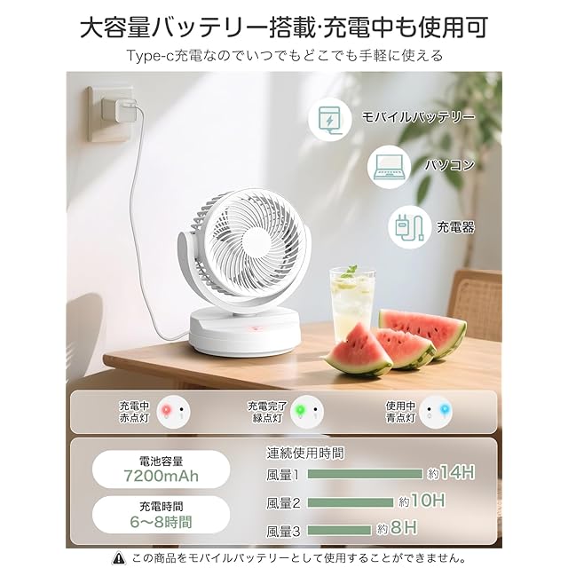 卓上&壁掛け2Way・7200mAh電池内蔵・Type-c充電・3段階風量調整・工具不要でお手入れ簡単・左右自動首振り・上下手動調節・充電しながら使用可・在宅・アウトドア使用可