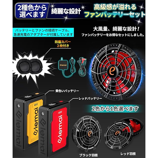 【セットの内容】48V高性能21700型バッテリーx1、48V対応ファンx2、接続ケーブルx1、急速充電器x1 、日本語取扱説明書/保証書x1。 メーカー直営で、製造から検品、販売までの流れをすべて弊社が1点1点丁寧に管理しております。バッテリーセットが日本国厳しい P S E 認証済みで、良い実用性と優れた耐久性を兼ね備えている安心安全の暑さ対策グッズです。商品が届いた後、初期に不具合があった場合や使用後1年以内に、商品の保証があります。出品者またはアフターメールに連絡すると、18時間以内に返信します。会員日の時期にはメールが多く、見落としてしまう可能性がありますが、24時間を超えて返信がない場合は、再送をお願いしますのでご了承ください。猛暑の夏に、ファン付き作業服用ファンバッテリーセットは建築現場、デリバリー、工場、ゴルフ、農作業、釣り、厨房、スポーツなどの屋外作業やエアコンの使用できない高温環境でも楽に仕事して作業効率を上げることができます。この熱い夏はこの高級感が溢れるファンバッテリーセットを持って、いつも快適な風を感じよう。