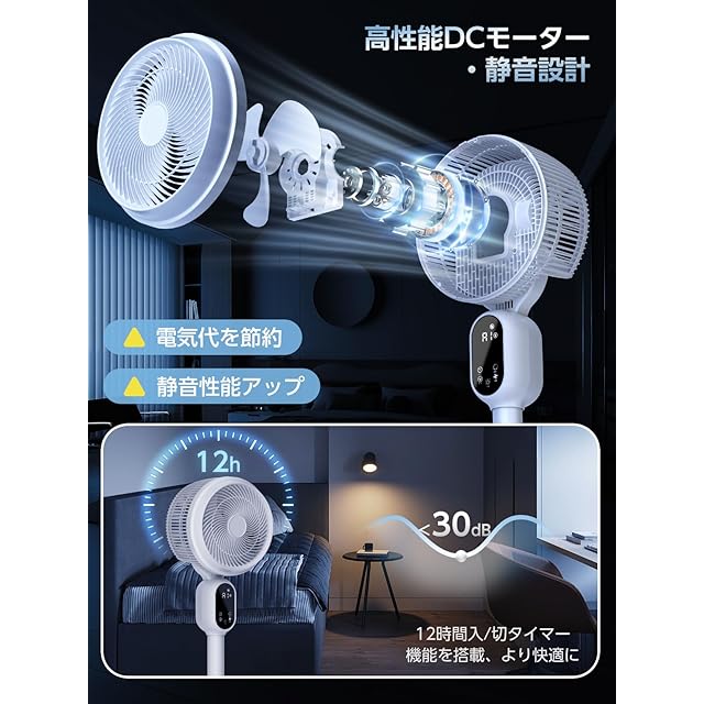 【快適で健やかな暮らしをサポートするイオン機能】最新のイオン機能を備えたリビング扇風機が、空気中のウイルスや花粉を抑え、清潔で爽やかな風を届けます。さらに、12時間タイマーを搭載し、設定した時間で自動的にON/OFFすることで、忙しい毎日に無理なく電気代を節約できます。運転パネルの消灯や静音運転への切り替えもリモコンで簡単に操作できるため、より快適な睡眠環境を作り出し、健康な睡眠を全面的にサポートします。