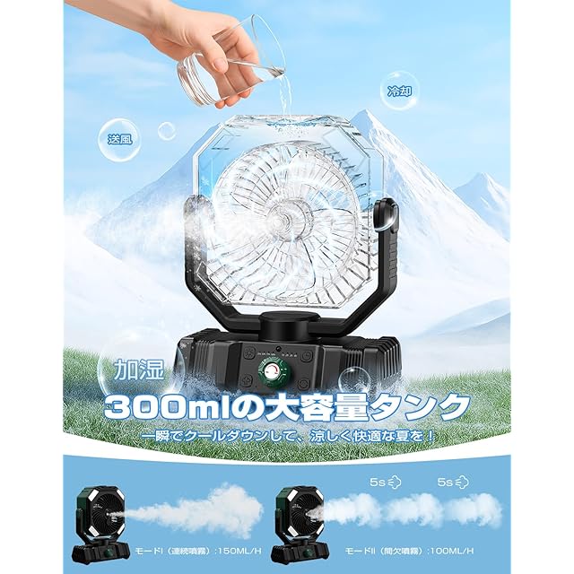 【瞬間冷却&進化型ミストファン】KINGLEAD卓上扇風機は新機能のミスト噴霧を搭載します。送風、ミスト加湿、冷気の3つの機能を兼ね備える進化版卓上冷風扇です。300mlの大容量タンクを内蔵し、爽やかな風と肌にふんわり広がる冷却ミストが二重の涼しさをお届けします。超微細ミストが猛暑でも素早く蒸発し、肌表面のクールダウンと発汗後の水分補給を同時に実現する。このミストファンの送風は通常の扇風機のより涼しい、エアコンより寒くない。十分な風量を確保しながらエアコンの涼しく快適な体験と加湿器の保湿効果を実現し、クーラーが苦手な方や、乾燥が気になる方にお勧めです。ミスト機能には2つのモード(連続噴霧モード/間欠噴霧モード)を搭載します。※氷水を加えるとより涼しくなりますよ!