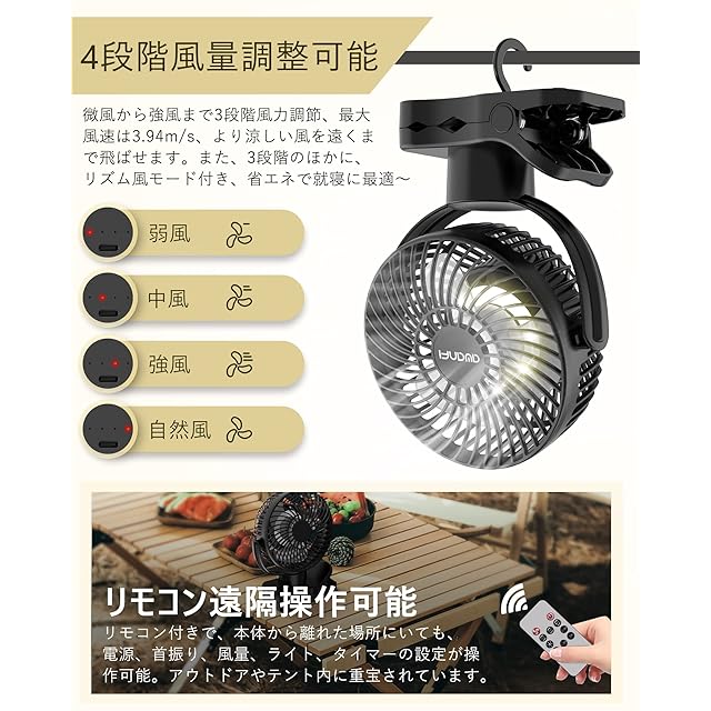 クリップ&卓上&吊り下げ式をまとめる小型扇風機:卓上扇風機ですが、クリップとフック付きで、テーブルやチェアのアームなどにセット可能、テント内部にも吊り下げられます。アウトドアでもリビングでも寮でもオフィスでもあらゆる場所に使用可能。普通の扇風機より利用率がアップ!