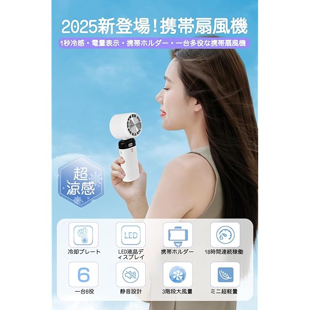 【2025最新携帯扇風機が登場!強力送風&1秒瞬時冷却&両手解放】 弊社の携帯扇風機は独自設計によって高性能ダブルタービン&高風量静音ファン&冷却プレート、強力送風を採用、1秒瞬時冷却、全身の体温もクールダウンしてくれ、暑い季節のマスク蒸れ軽減、熱中症対策に!また、卓上/手持ち/首掛け/冷却ファン4WAYハンディファン。冷却プレート付き、ボタンを長押しすると、2秒後にプレートが冷え始め、頬や首元などにあてて、物理的で体感温度を下げ、真夏の熱中症対策に最適です。スマホスタンド付き、卓上に置いて、爽やかな風を楽しみながら、スマホでのビデオ鑑賞、ビデオ通話なども便利です。
