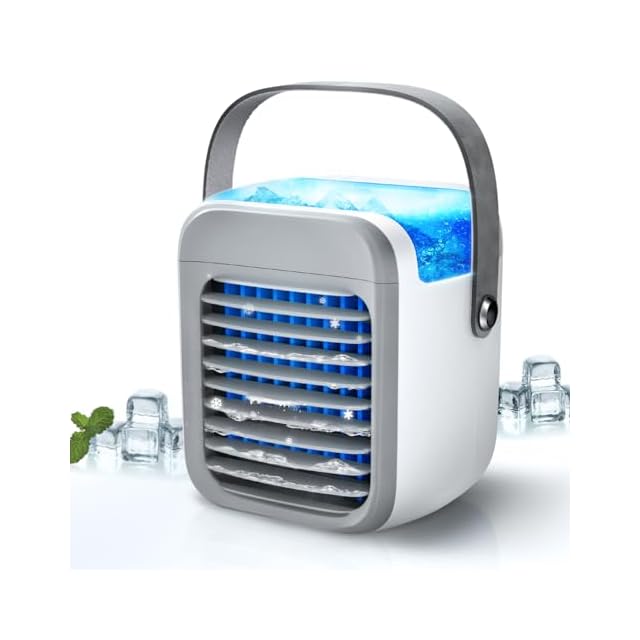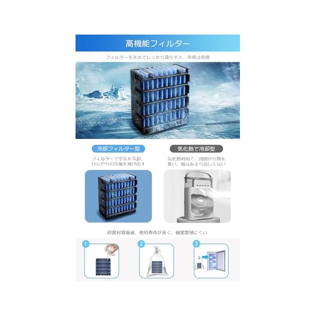 【コンパクト ミニクーラー】幅17.3×高さ15.2×奥行17.3cmの卓上サイズで、コンパクトながらも高機能。皮革素材の手提げ付きで好きな場所へ簡単に移動可能です。抗菌素材のフィルターは水洗い可能で、使用寿命を延ばし、細菌の発生や増殖を抑制します。300mlの大容量水タンクは上部から給水でき、水漏れ防止設計で安心して使用できます。氷を入れてさらに冷却効果を高めることも可能です。