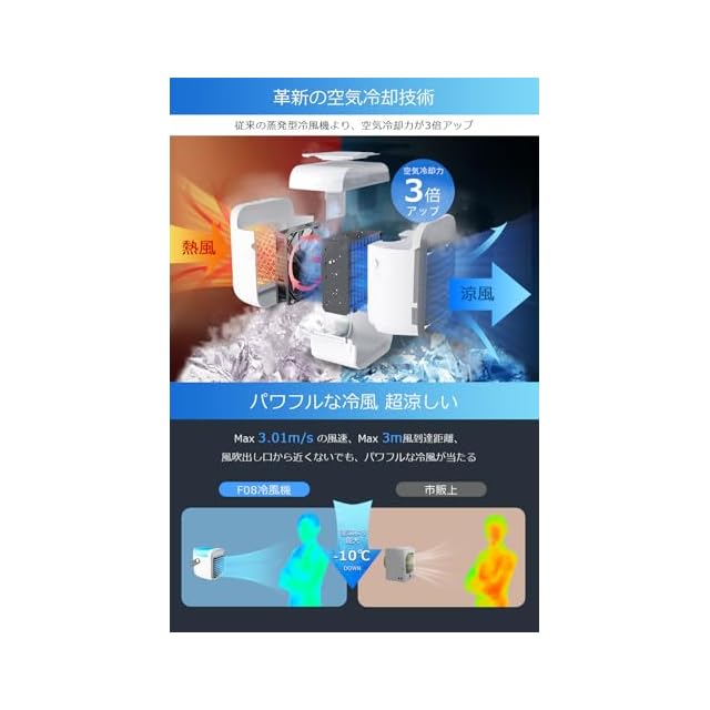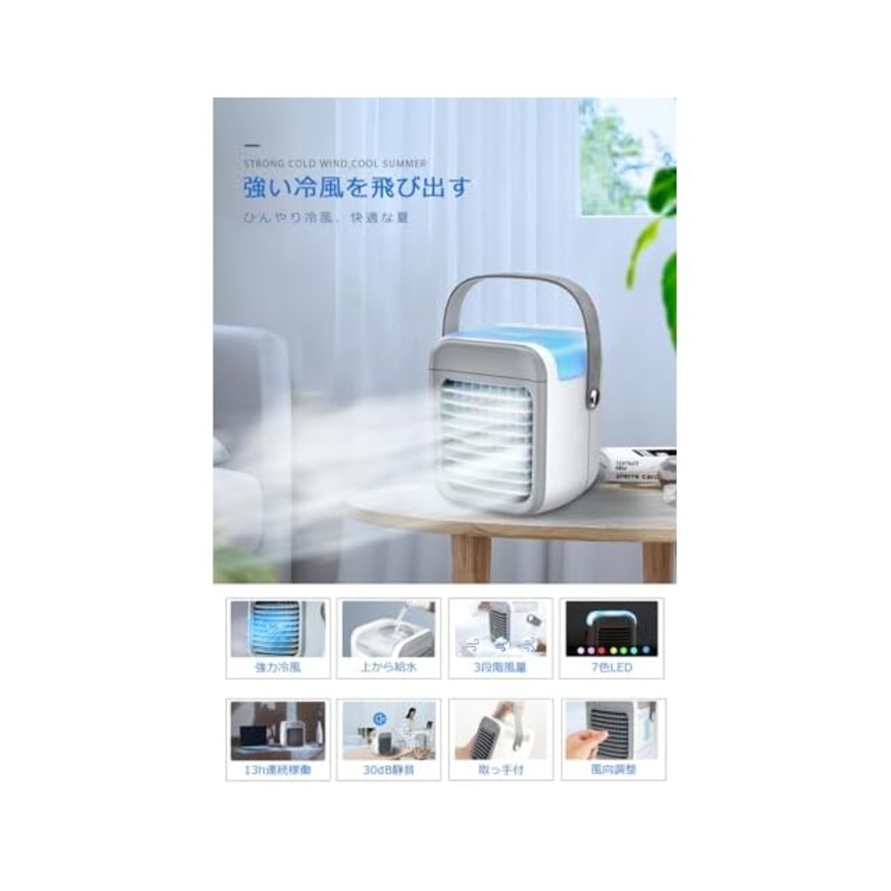 【充電式冷風機 静音設計】3000mAhバッテリー内蔵で、USB充電により最大13時間連続使用可能です。さらに、30dbの静音設計で動作音がほとんど気にならないため、仕事や就寝時にも快適に使用できます。どこでも手軽に持ち運べるポータブル設計で、オフィスや寝室、キャンプなど様々な場所で活躍します。