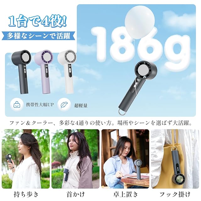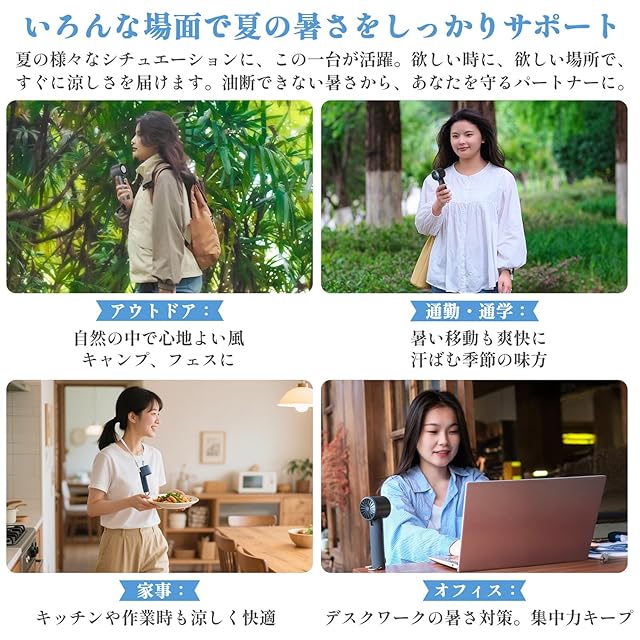 【わずか186g!軽量・コンパクトで持ち運びラクラク】涼しさを持ち歩こう!扇風機の重量はわずか186g、持ち運びもラクラク。バッグに入れても、手に持っても負担にならず、どこでも手軽に使用できます。通勤・通学中の暑さ対策、旅行やアウトドア、お子様連れのお出かけなど、あらゆるシーンで大活躍。自宅、オフィス、車内、通勤、通学、お買い物、散歩、花火大会、お祭り、野外フェス、イベント、スポーツ観戦、キャンプ、旅行など、さまざまなシーンで大活躍間違いなし!2025年の夏には、必須アイテムとなること間違いなしのハンディ扇風機です。