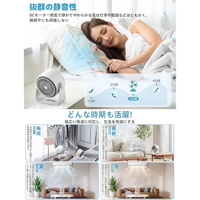 【風量5段階調整&超静音設計】5段階風量調節が可能。微風から強風までお好みに設定でき、お部屋の空気を循環し換気します。小さく場所を取らないので卓上扇風機としても使用可能です。稼働中の音が囁き声と同レベルで、気にならない静音設計です。就寝時も静かな環境が得られ、作業も邪魔せず圧迫感を感じさせません