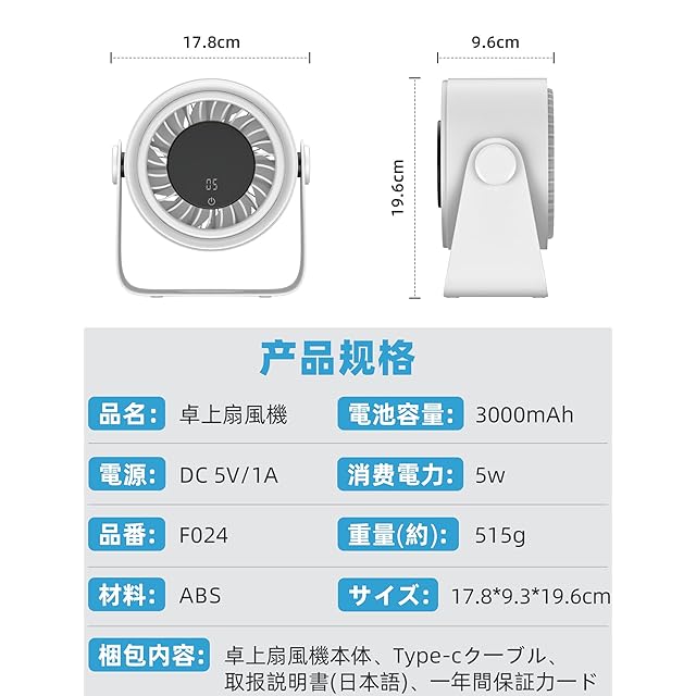 【 LEDデジタルディスプレイ】このUSB扇風機は3000mAhの大容量バッテリーを搭載し、1回のフル充電で最大15時間使用できます。大型LEDディスプレイを搭載し、バッテリー残量、風量段階、運転モード表示を常に一目で確認できます。Type-C充電システムにより、高速で簡単な充電が可能です。軽量設計で、通勤やキャンプなど外出先への持ち運びも簡単です。*付属の充電ケーブルをご使用ください。