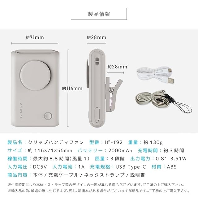 【商品詳細】サイズ:約116×71×56mm 重量:約130g バッテリー容量:2000mAh 充電時間:約3時間 稼働時間:最大約8.8時間(風量1) 風量:3段階 出力電力:0.81-3.51W 入力電圧:5V 入力電流:1A 充電規格:USB Type-C 材質:ABC 商品内容:本体/充電ケーブル/ネックストラップ/説明書