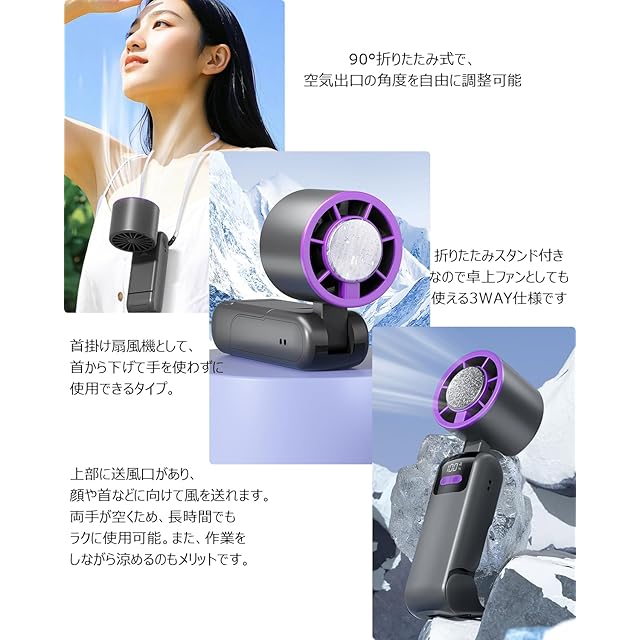 1台多役・ネックストラップ付き首掛けファン①ファン は90度まで折りたたむことができ、直接折りたたんで卓上扇風機 に変身できます。②スタンドも引き出してテーブルファンとして変身させることができます。③ネックストラップがついており、首掛け扇風機 として簡単に持ち運べます。
