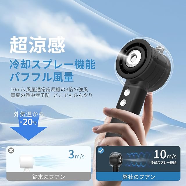 2025年夏の新機能!冷却スプレー機能 1秒冷感,冷ミスト,暑い夏にぴったり!ポータブルファンは暑くて湿気の多い夏を涼しく保つための必須アイテム!また、このポータブルファンには高速モーターと噴霧装置が搭載されており、冷却スプレー機能-トので今年の夏はヒンャリ涼しくお出かけしましょう!肌に触れた瞬間、まるで冷えた缶ジュ-スを押し当てたような涼しさを感じられます。旅行やお出かけ時に欠かせない暑さ対策グッズです。