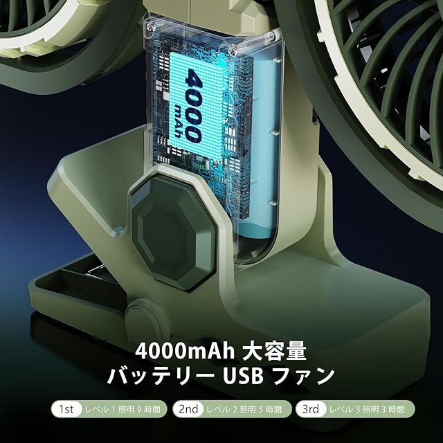 【2段階スマート調光&省エネ設計】強/中/弱の3モード切替でシーンに応じた最適な風量を選択。強モード(最大4.2m/s)で集中冷却、弱モード(1.8m/s)で持続的な微風を実現。製品は2段階調光可能なLEDライトを搭載しており、状況に応じて明るさを変えて使用できる。
