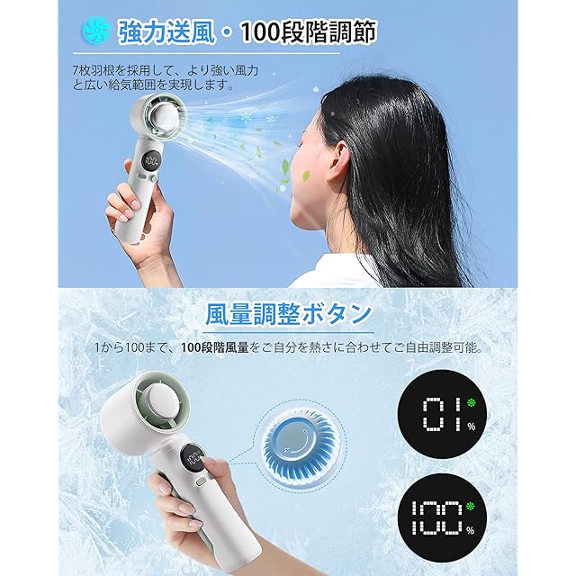 【1~100段風量調節・角度調整可能】1から100段階風量調節機能により、気温や使用シーンに合わせて風量を調整できます。冷却モードでは、肌に冷たさを伝え、冷却グッズとしても利用でき、熱中症対策にも最適です。また、空気力学に基づいた小型ファンヘッドには、6枚の羽根が搭載され、風力の効果を増幅し、通常の手持ち扇風機よりも送風効率を向上させます。また、本携帯扇風機の底部には滑り止め素材が採用されて、卓上扇風機として安定に置くことだけでなく、角度も調整することができ、手に持って疲れたらいつでも両手を解放することができます、どちらでも簡単に風を当て夏の涼しさを楽しめます。