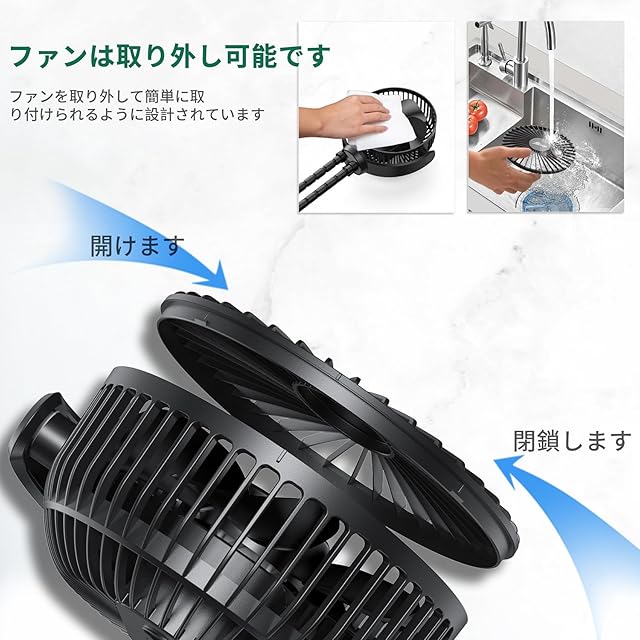 【4WAY多機能アーム&クランプ式固定】柔軟なアルミ合金アームで卓上設置・クランプ固定・巻き付け・吊り下げが自由自在。ゴルフカートのシートやトレッドミル、にも簡単装着。屋外旅行やテント内でも安定した送風を実現。
