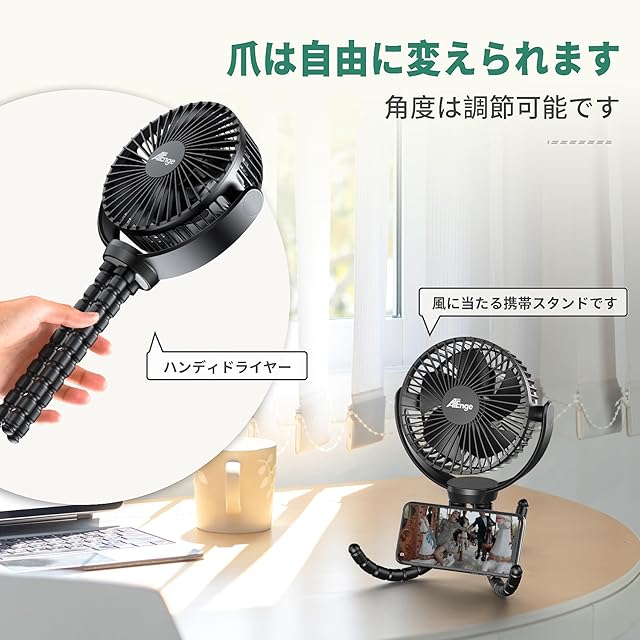 【720°全方向調節&集中送風】ヘッド部を上下左右に自在調整し、テーブルトップやカーシートの死角まで風を到達。軽量ボディ(320g)で角度固定も安定。