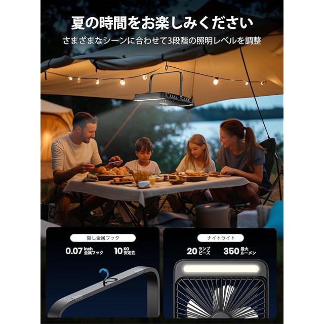 オフィス、家庭、アウトドアなど、さまざまなシーンで使用可能。テント内やベッドサイドでの懸垂使用にも最適で、快適な風と明かりを提供します。