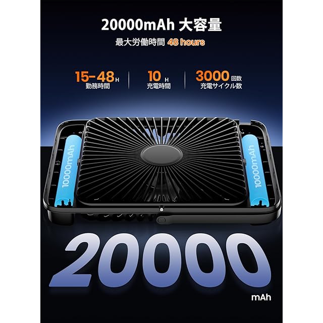 【パワフルで効率的な冷却性能】大容量の20000mAh充電式バッテリーを搭載し、1回のフル充電で最大15~48時間の連続運転で一日中涼しく保ちます。 4速設定と5枚刃デザインにより、パワフルでありながらささやき声を出す静かな冷却を提供し、オフィス、自宅、アウトドアアドベンチャーに最適です。