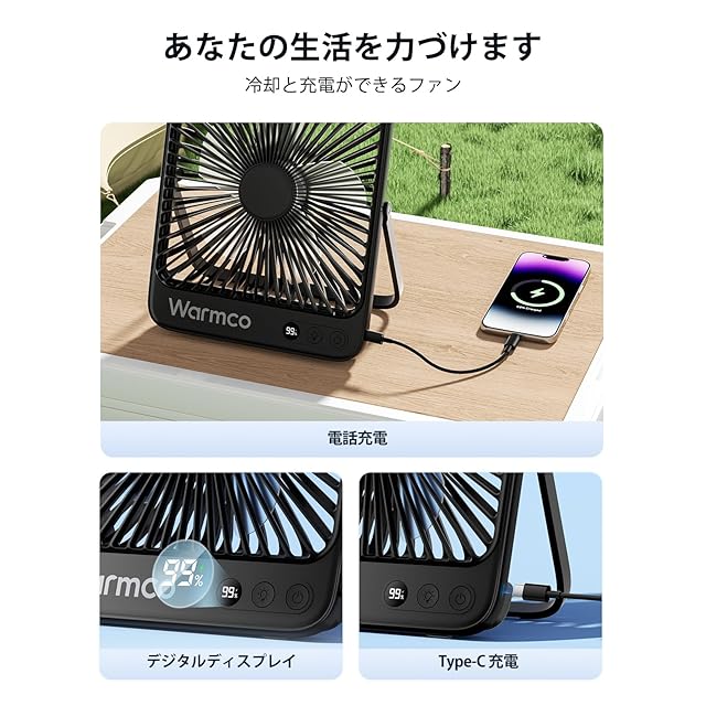 内蔵LEDライトで、キャンプや夜間の作業中にも明るさを提供。一つのデバイスで風と光の両方を楽しめます。
