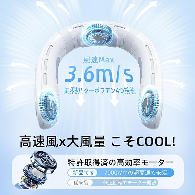【羽なし首掛け扇風機 涼感プレート】この首かけ扇風機は、羽がないため髪の毛が巻き込まれる心配がなく、安心して使えます。首にかけるデザインなので、両手が自由に使えてとても便利。家事や外出時にも大活躍し、手を使う作業中でも涼しさを楽しめます。最新の涼感プレートを搭載しており、アルミニウム製のプレートが肌に触れるとひんやり感を提供します。特に暑い夏の日には首元を涼しく保ち、全身がリフレッシュできる効果抜群のアイテムです。