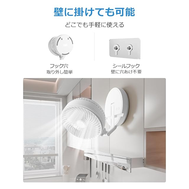 【多機能1台2役扇風機】卓上扇風機としての使用はもちろん、本体底面に壁掛け用のフック穴が備えられており、壁掛け扇風機としても使用可能です。コンパクトながら、どの場所にもフィットするシンプルなデザインで、オフィス、キッチン、寝室など、さまざまなシーンで大活躍します。使わない時には折りたたんで収納可能で、室内の卓上だけでなく、アウトドアにも携帯便利です。