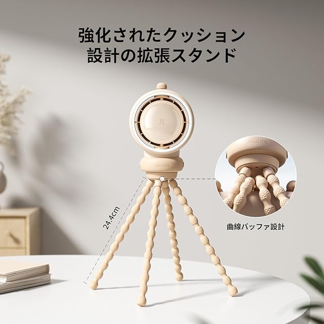 【小型扇風機】2024年新デザイン充電式扇風機!指が触れるのを防ぐブレードレスタービン設計が特徴で、4隅のブラケットはTPUシリコン製で、75mmの強化および延長されたシリコンブラケットはより大きな摩擦面積を提供し、耐久性を高めます。他の三脚ファンよりも耐久性と柔軟性に優れています。